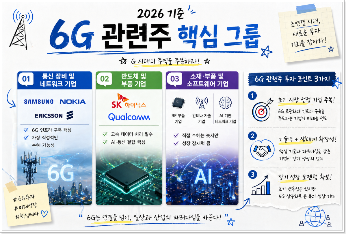 6G 관련주를 2025~2026 최신 기준으로 정리했습니다. 핵심 기업, 투자 포인트, 리스크, 전망까지 한 번에 확인하세요.